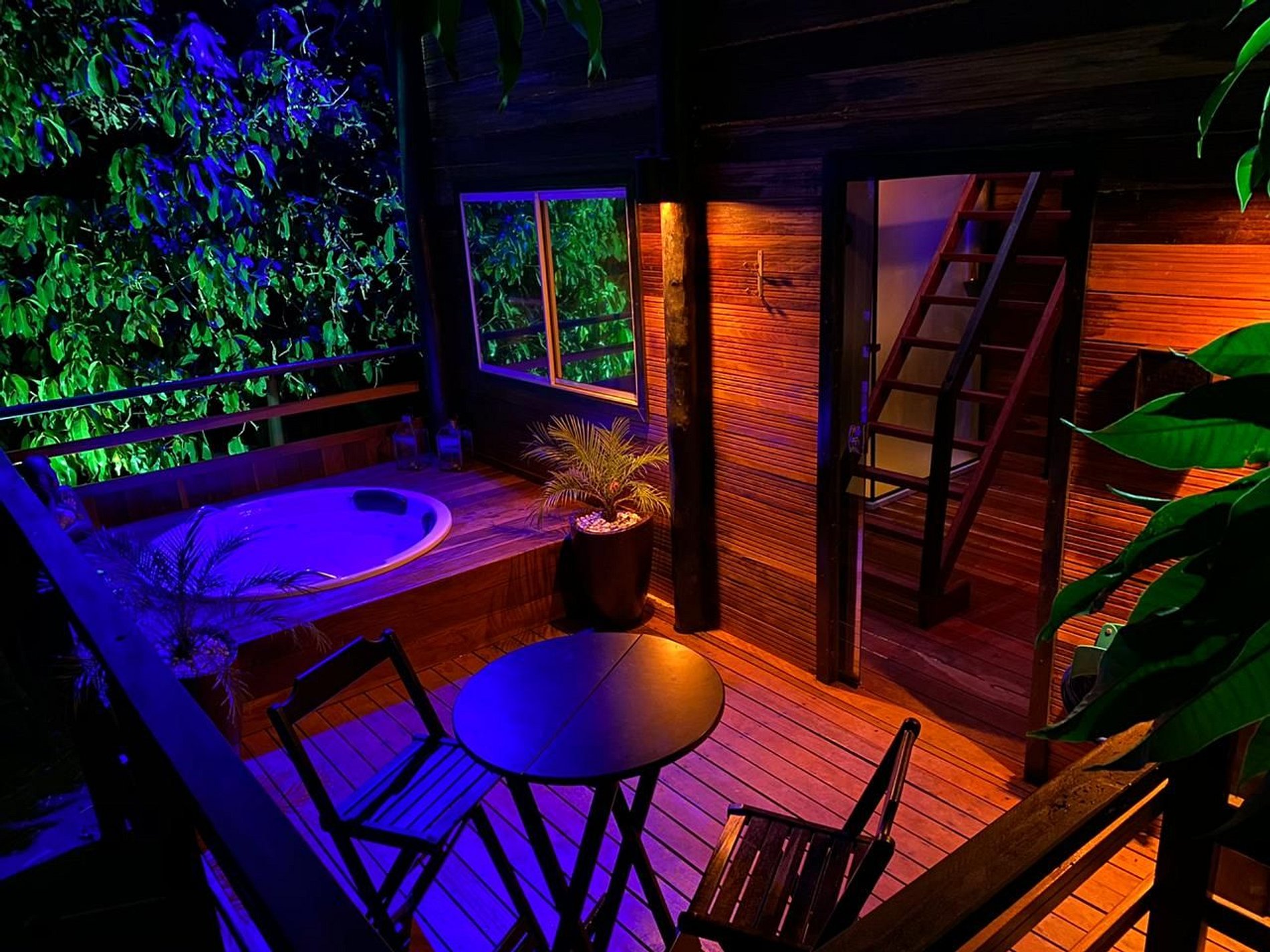 Mezanino com quarto do casal e cama queen size;Pavimento inferior com cozinha americana integrada ao living;Deck privativo de 2,3 m x 5m, equipado com banheira de hidromassagem.