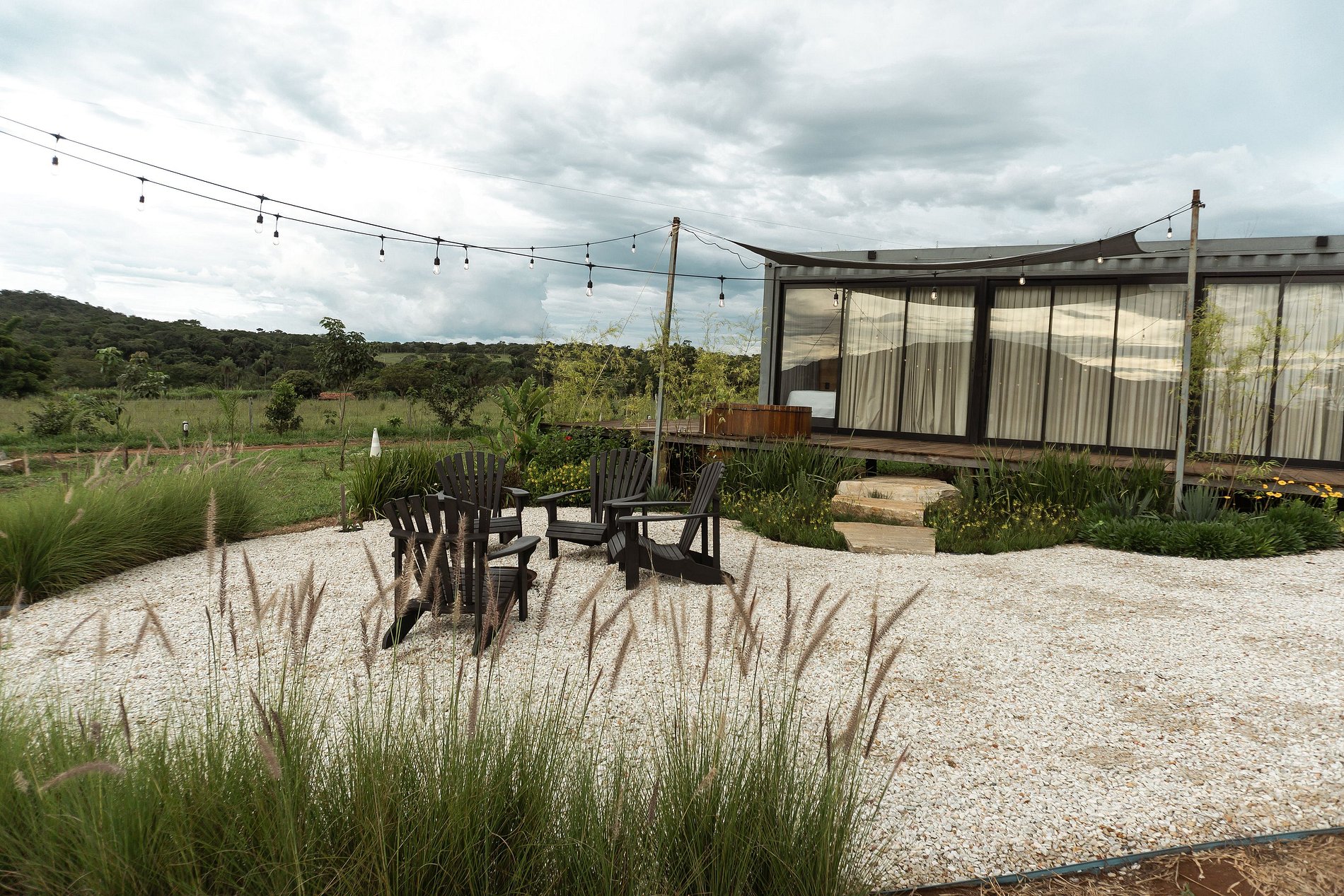 É sobre estar presente. A arquitetura leve, em vidro e madeira, dissolve os limites entre interior e exterior. A paisagem entra devagar, com a luz da manhã desenhando sombras no chão e o som do Cerrado preenchendo o ar.