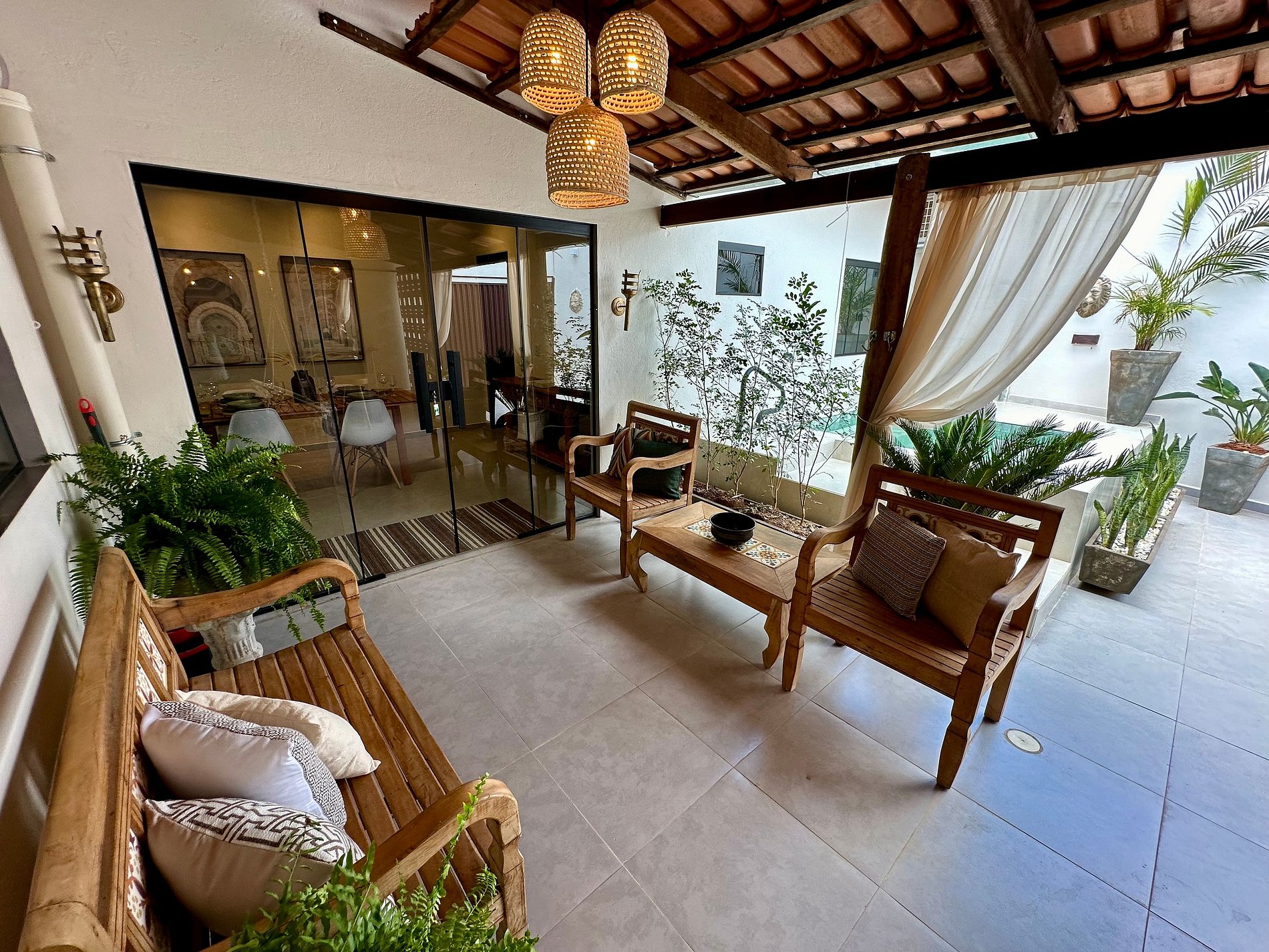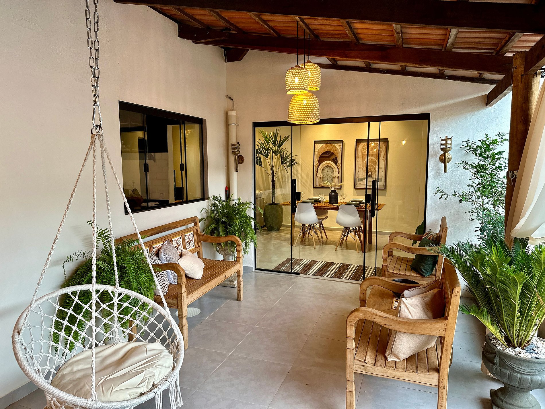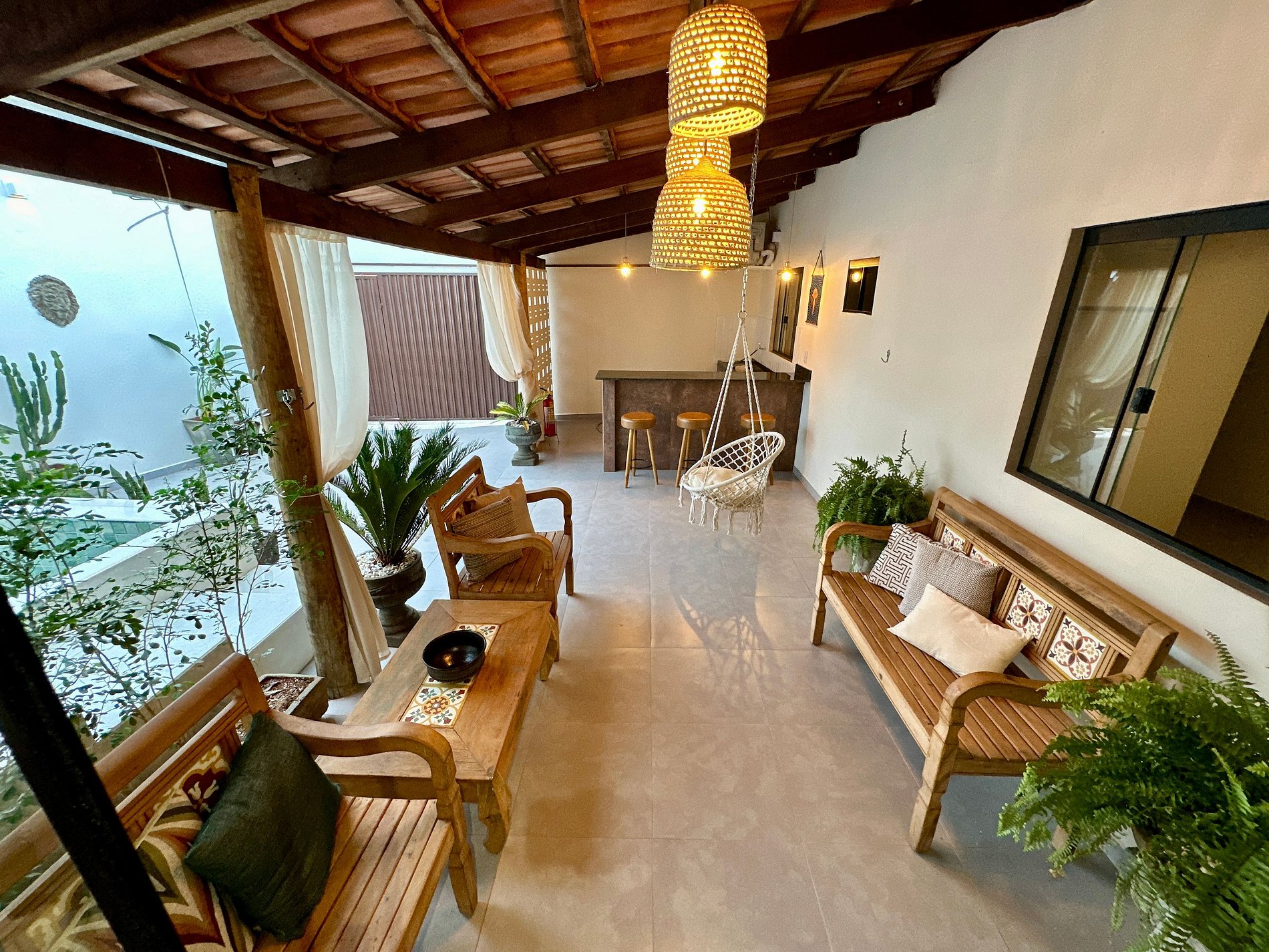 A casa oferece ainda uma cozinha equipada com churrasqueira elétrica, varanda temática e uma piscina (com aquecimento solar) e com acabamentos em cerâmica e titânio, ideal para momentos de relaxamento. A decoração é assinada pelo design de interiores Nildo Alves e conta com elementos rústicos e ecológicos, harmonizando o ambiente com a cultura local.