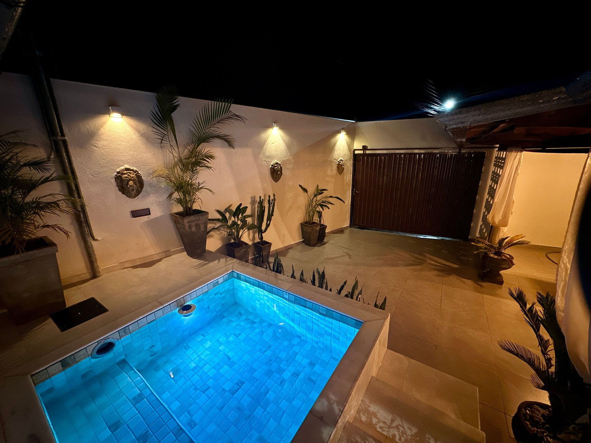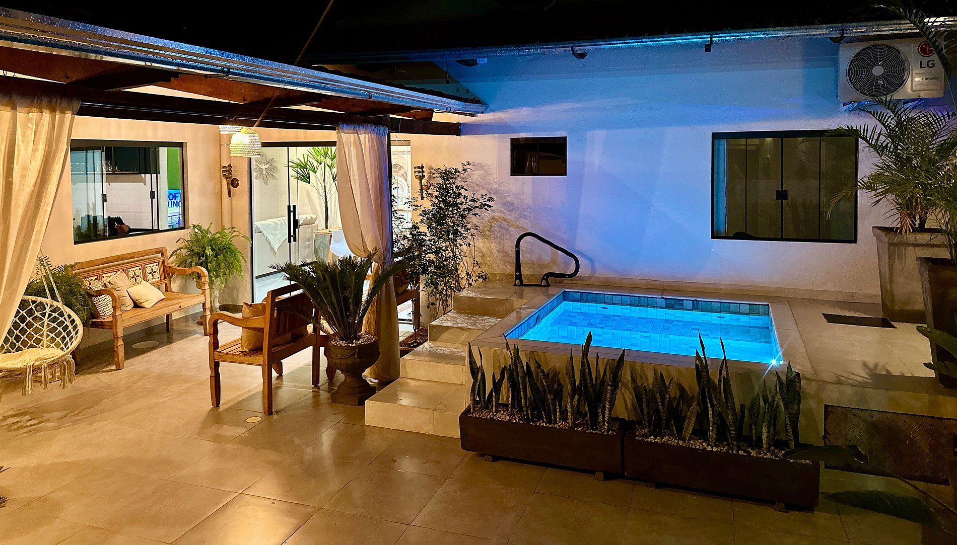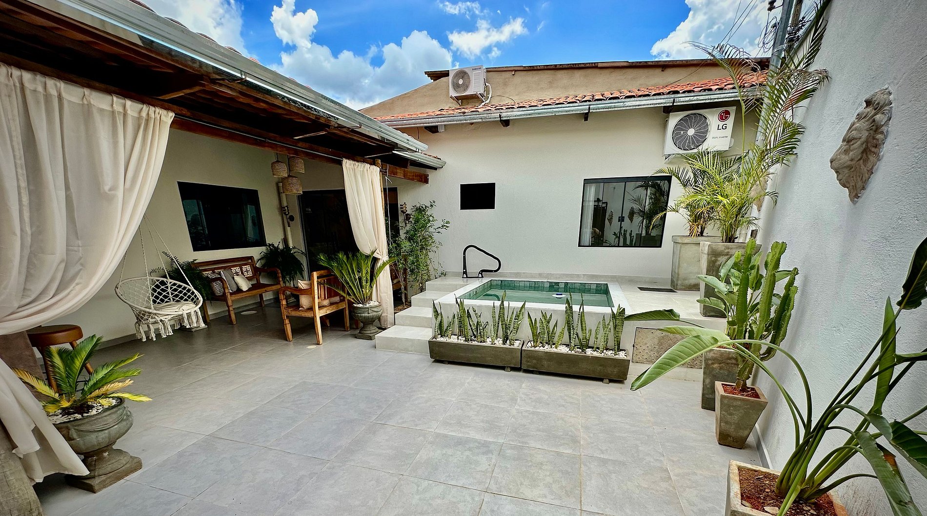 A casa oferece ainda uma cozinha equipada com churrasqueira elétrica, varanda temática e uma piscina (com aquecimento solar) e com acabamentos em cerâmica e titânio, ideal para momentos de relaxamento. A decoração é assinada pelo design de interiores Nildo Alves e conta com elementos rústicos e ecológicos, harmonizando o ambiente com a cultura local.